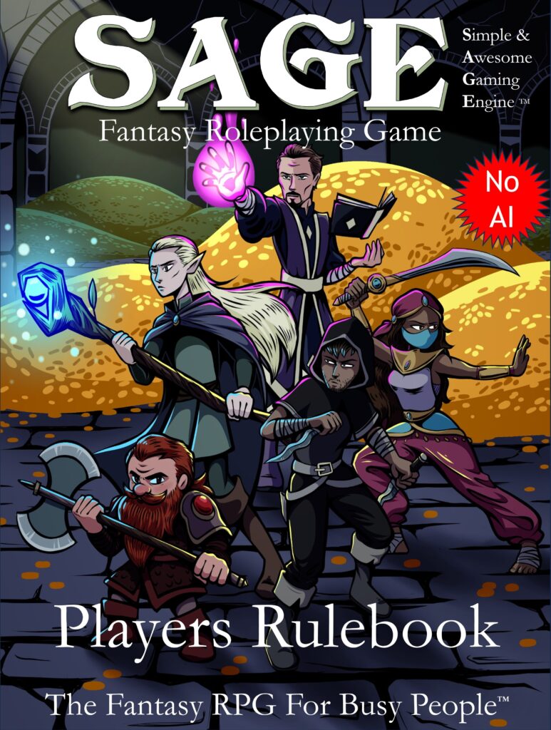 SAGE stands for “Simple & Awesome Gaming Engine,” and it’s a fun and easy way to adventure, meant for busy people (new players and veterans) who don’t have the time or inclination to power through 500+ pages of rules spread across multiple books.