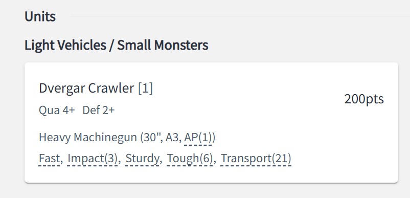 The third option is APCs–armored personnel carriers–which have the Fast rule, meaning that they can move 8″ a turn and shoot, or go 16″ and not shoot. The standard Dwarf Guild APC carries 11 guys and costs 195 points, but OnePageRules has an option to create your own units, so I came up with something a smidge more expensive (200 points) that carries 21 close-combat warriors into the fight.