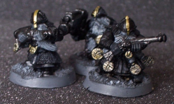 Backing those up are four squads of 5 Dwarves each, but instead of the basic rifle, they carry “iron blasters,” a quaint gun with 18″ range and 2 shots per round, with -1 to opponent armor saves.