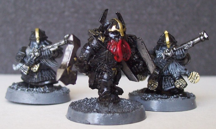I had a horde to paint, so I kept the scheme very simple and easy to do. I primed the figures black, then went over armor, helmets, clothes, and boots in Chaos Black. Skin was (what was called) Codex Grey (for an alien look), hair and beards were Codex Grey with Skull White drybrushed over them. I also drybrushed Boltgun Metal over weapons and Shining Gold over medallions and other “bling” that each Dwarf figure might have.