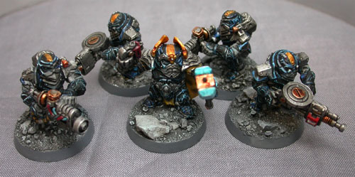 In homage to my favorite American football team, the Pittsburgh Steelers, I painted a gold stripe down the middle of each helmet. I “dusted” the black areas with Codex Grey for some highlighting, and washed each figure in thinned-down Chaos Black. Bases were sand flocking, painted Codex Grey with a black wash and highlighted with Space Wolf Grey.